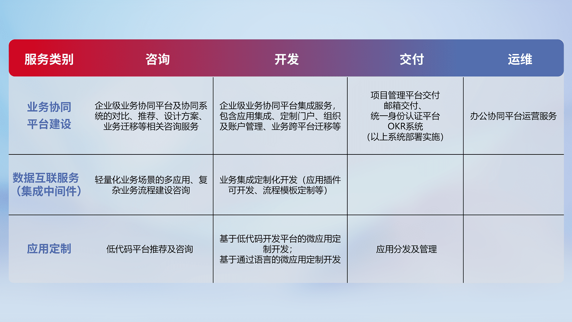 针对钉钉、、、、企微、、、IDaas等平台级产品提供产品的规划、、、、方案、、、、交付、、、、定制化开发等服务,,,,实现如统一协同办公、、智能客户服务、、混合会议管理、、、、智能数据查询、、、、等业务场景,,实现数字化转型。。。。