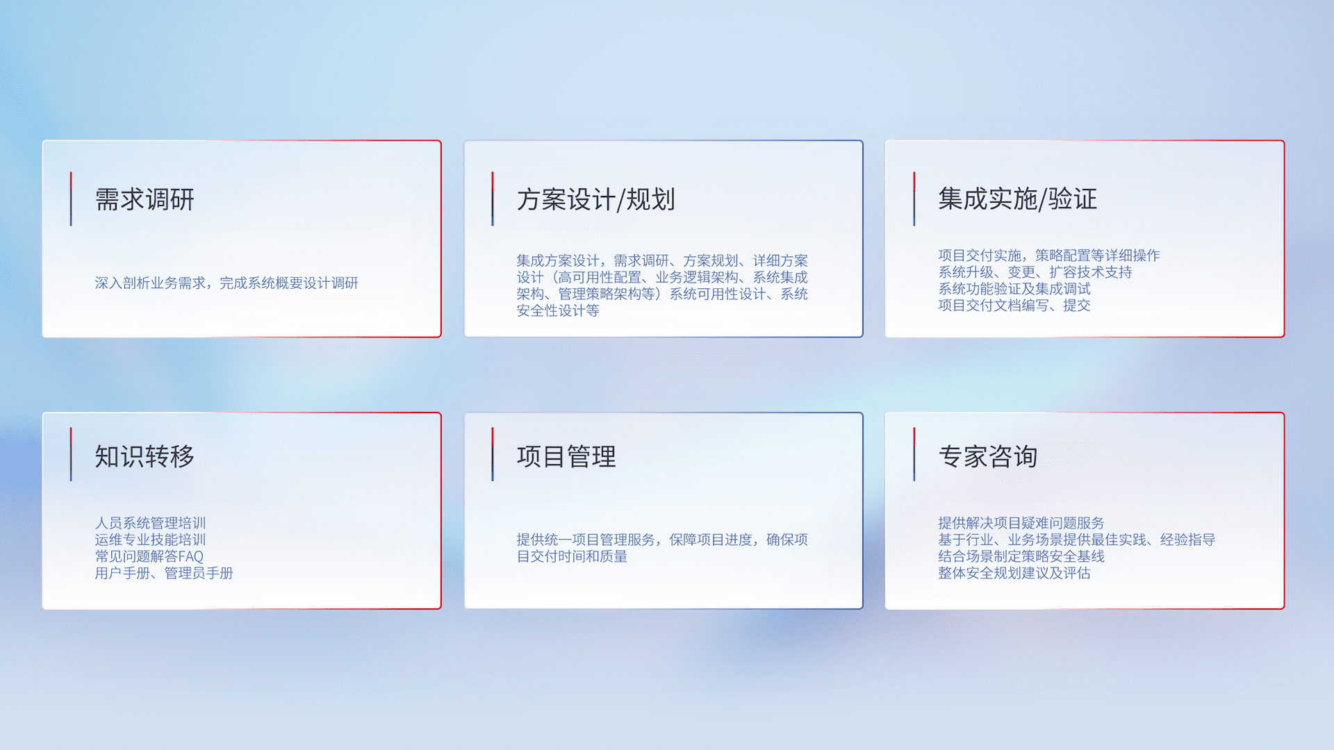 针对客户行业特性,,,将宏观的安全战略和需求,,,通过专业的交付服务,,实现项目落地,,为客户提供标准规范的集成交付服务。。